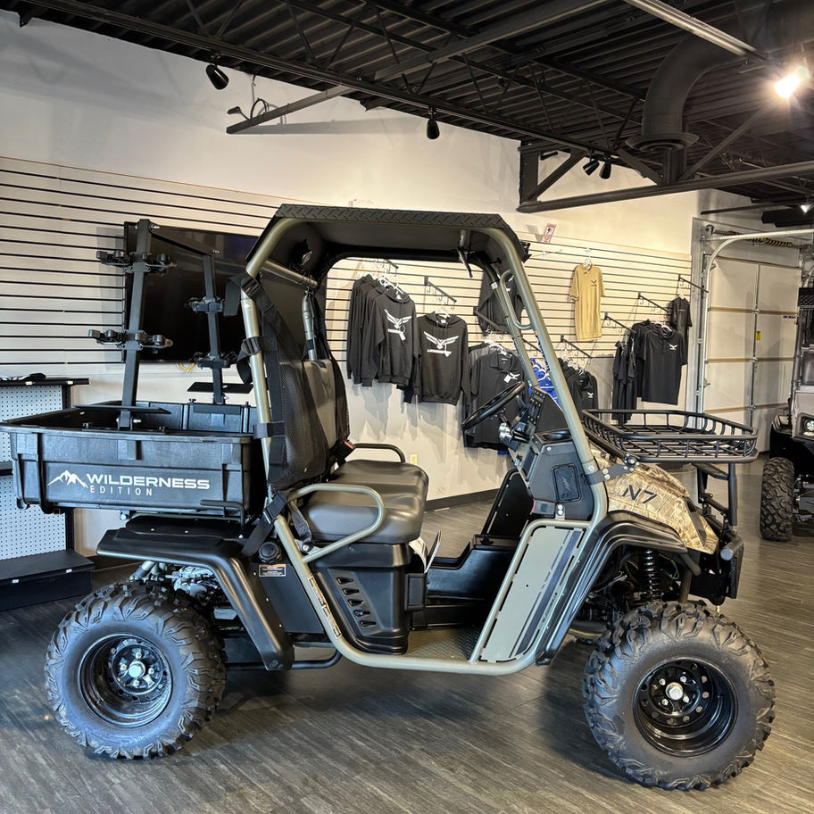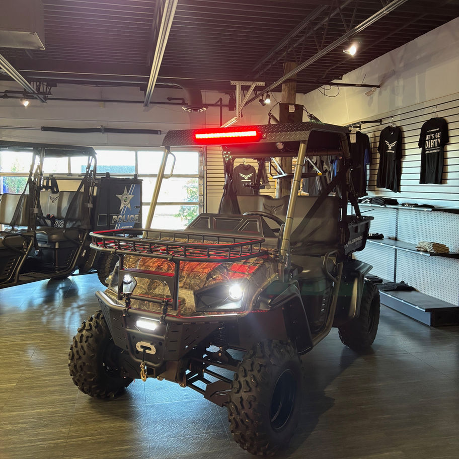 Content included: poly bed, HD bumper with LED light, custom color: forest green, Real Tree camo hood, winch, split windshield (not pictured), CV guards, metal roof, EPS power steering, armory rack, dome light, 20" red LED hunt light, rear work light, USB charger, center console with lockable storage, rearview mirror, front hood rack